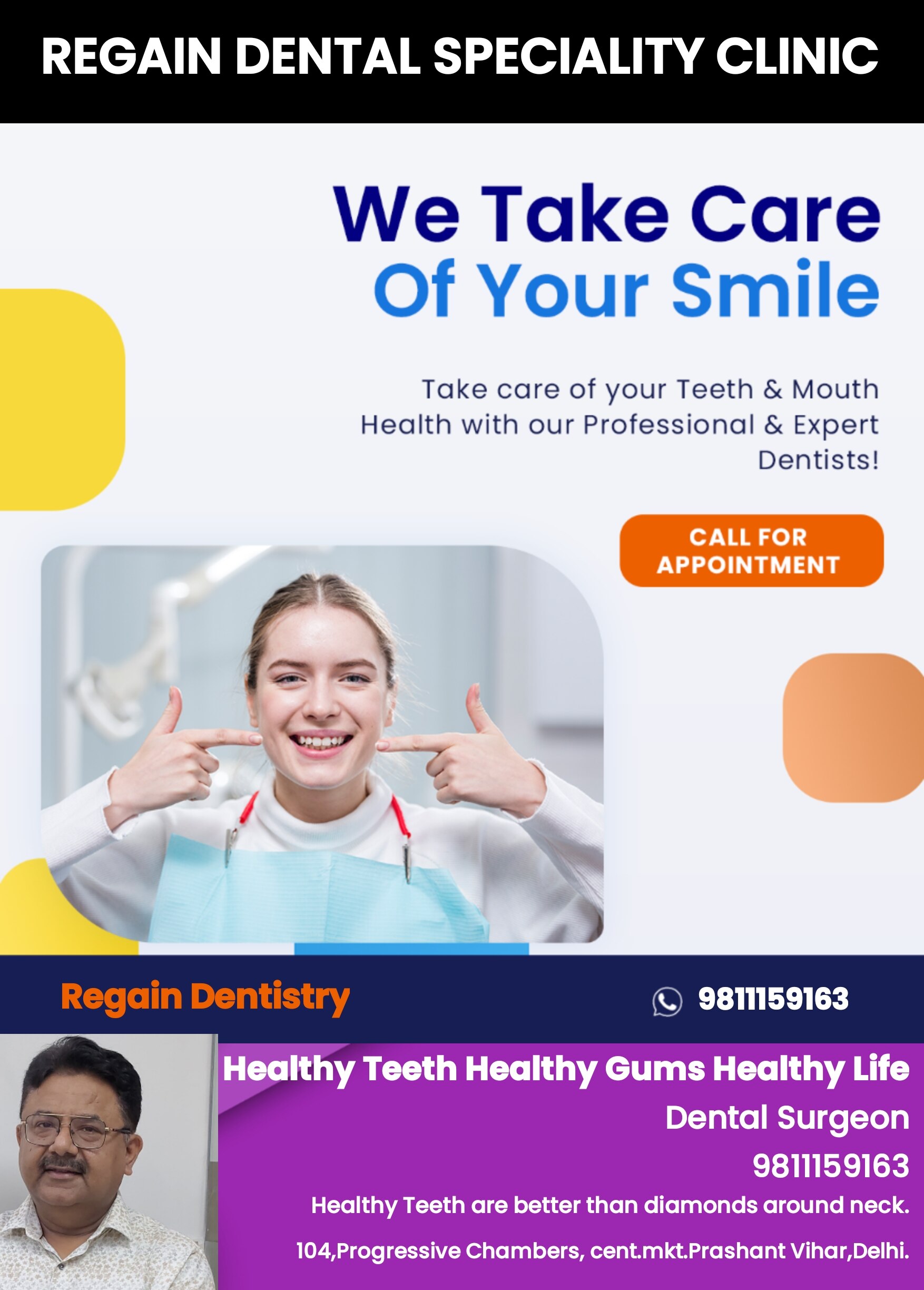 Regain Dental Speciality Clinic – Prashant Vihar Delhi-110085 Regain Dental Speciality Clinic, located in the heart of Prashant Vihar, stands as one of the premier dental care providers in the region. Renowned for its patient-centered approach, advanced technology, and a team of highly qualified dental specialists, Regain Dental offers comprehensive dental solutions under one roof. From routine checkups and preventive care to advanced cosmetic dentistry, orthodontics, implants, and surgical procedures, the clinic is fully equipped to meet every dental need with precision and care. Our modern facility combines cutting-edge equipment with the highest standards of sterilization and hygiene to ensure patient safety and comfort at every step. At Regain Dental, we believe in restoring not just smiles, but confidence. Our friendly staff and expert doctors are dedicated to providing personalized care tailored to each patient, making us the go-to destination for families and individuals seeking top-quality dental treatment. Why Choose Regain Dental? ✓ Trusted by hundreds of happy patients ✓ All dental specialties under one roof ✓ Experienced and certified dental professionals ✓ State-of-the-art equipment & technology ✓ Transparent pricing and treatment plans Whether you're looking for a routine dental checkup or a complete smile makeover, Regain Dental Speciality Clinic is your trusted partner in oral health and aesthetics.