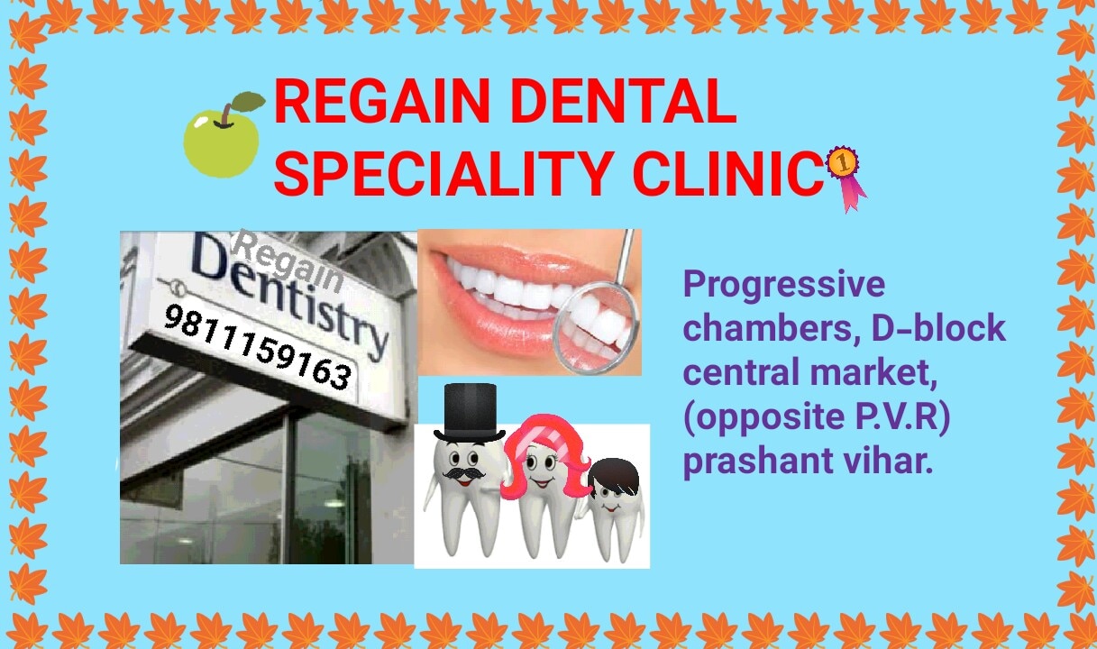 Regain Dental Speciality Clinic 104 First floor, progressive chambers, D-block, Central Market, Prashant Vihar, Rohini sec-14, Delhi, 110085, India +918045135310